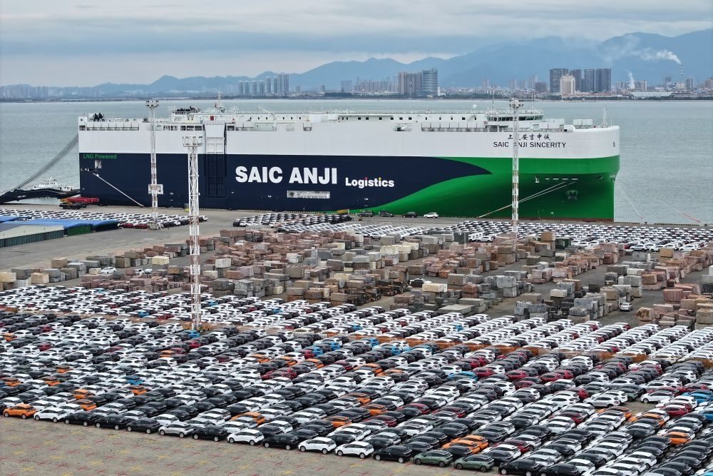 2024年1月23日,“上汽安吉申誠(chéng)”號(hào)汽車滾裝船??吭诟=◤B門(mén)東渡港區(qū)現(xiàn)代碼頭(無(wú)人機(jī)照片)。新華社記者 姜克紅 攝