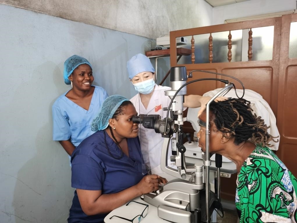 1月31日,在貝寧莫諾和庫福省中心醫(yī)院眼科診室,中國援貝寧醫(yī)療隊醫(yī)生正指導(dǎo)當(dāng)?shù)刈o士為患者做檢查。