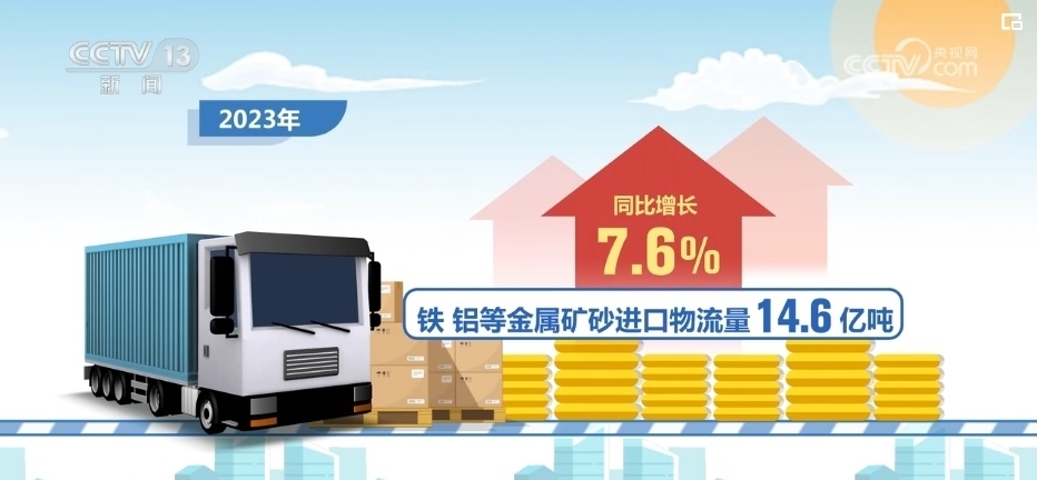 2023年,進口物流總額18.0萬億元,同比增長13.0%,進口物流量保持快速恢復態(tài)勢。原油、天然氣、煤炭等能源產品進口物流量11.6億噸,同比增長27.2%,鐵、鋁等金屬礦砂進口物流量14.6億噸,同比增長7.6%。