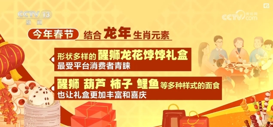 不僅如此,2024年春節(jié),結合龍年生肖元素,形狀多樣的醒獅龍花餑餑禮盒最受平臺消費者青睞。而醒獅、葫蘆、柿子、鯉魚等多種樣式的面食,也讓禮盒更加豐富和喜慶。