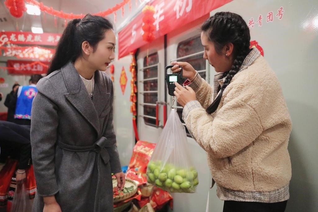 春節(jié)臨近,家家戶戶忙著采買年貨。中國(guó)鐵路昆明局集團(tuán)有限公司在云南昆明至元謀西的公益性“慢火車”7466/5次列車上辦起了年貨街。