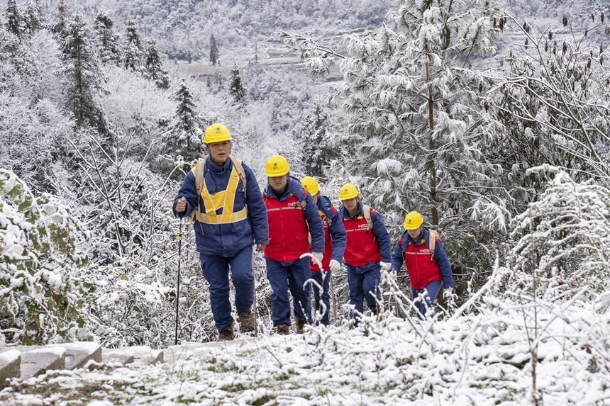 2月9日,在彭水縣中嶺山,國網(wǎng)重慶電力員工對電力線路開展冰雪特巡。牟偉攝