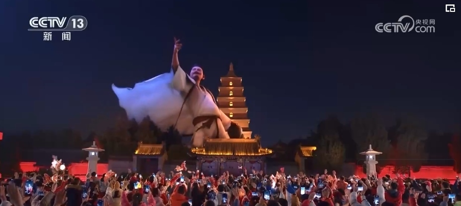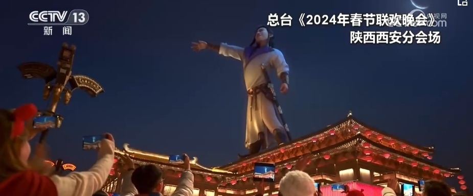 除夕當(dāng)晚9時(shí),西安分會(huì)場(chǎng)《山河詩(shī)長(zhǎng)安》篇章的“打開方式”讓人眼前一亮。在科技助力下,“詩(shī)仙”李白跨越歲月長(zhǎng)河“穿越”而來,在煙火璀璨中,隨著熙熙攘攘的人群一起走進(jìn)西安城墻永寧門,走入千年后的耀眼長(zhǎng)安。