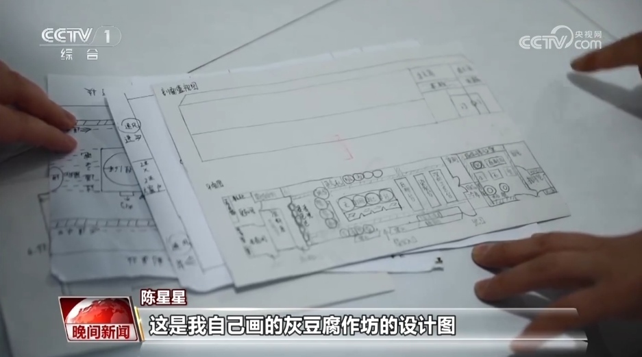 陳星星:這是我自己畫的灰豆腐作坊的設(shè)計圖。我們之前用傳統(tǒng)的在家里做的這種方式做出來的豆腐的話,一天最多可能就是一兩百斤的樣子,那么經(jīng)過我們這樣的一個改進的話,一天可能能達到一兩千斤的產(chǎn)量。