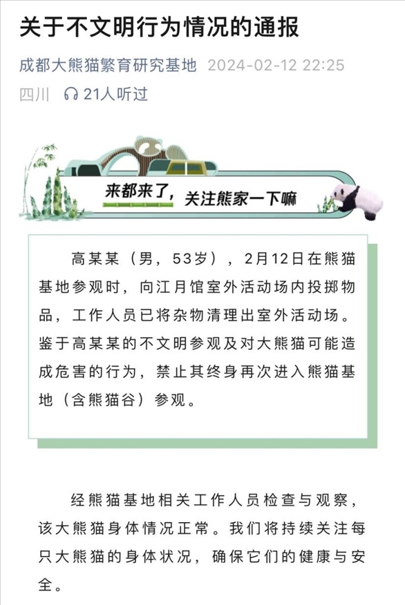 ·一游客在成都大熊貓基地參觀時(shí)向場(chǎng)內(nèi)投擲物品,被終身禁入。