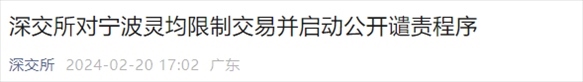 根據(jù)深交所《限制交易實(shí)施細(xì)則》《自律監(jiān)管措施和紀(jì)律處分實(shí)施辦法》等相關(guān)規(guī)定,深交所決定,從2024年2月20日起至2024年2月22日止對(duì)寧波靈均名下相關(guān)證券賬戶采取限制交易措施,限制其在上述期間買(mǎi)賣(mài)在深交所上市交易的所有股票,并啟動(dòng)對(duì)寧波靈均公開(kāi)譴責(zé)紀(jì)律處分的程序。