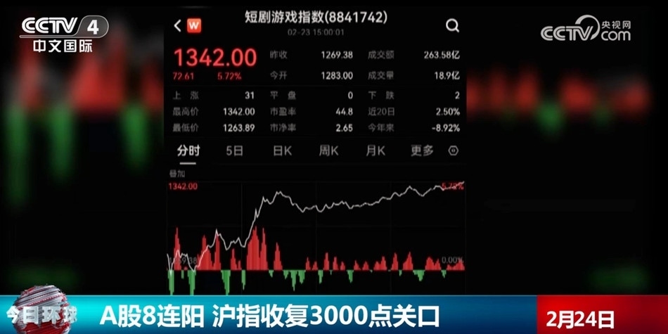 2月23日A股再度發(fā)力,上證指數(shù)收報3004.88點,漲幅0.55%;深證成指收漲0.28%。滬指“八連陽”收復了3000點整數(shù)關口。?
