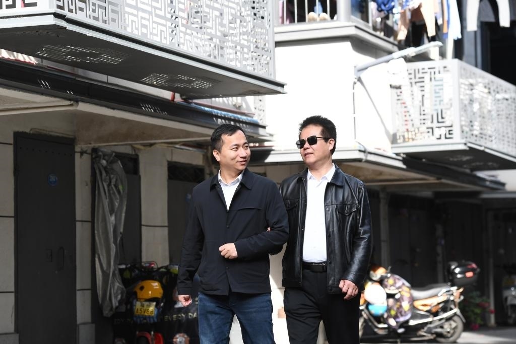 王永澄(右)在志愿者的協(xié)助下前往福州市鼓樓區(qū)紅墻巷小區(qū)調(diào)研盲人家庭子女入學(xué)及保障房入住情況(2月18日攝)。
