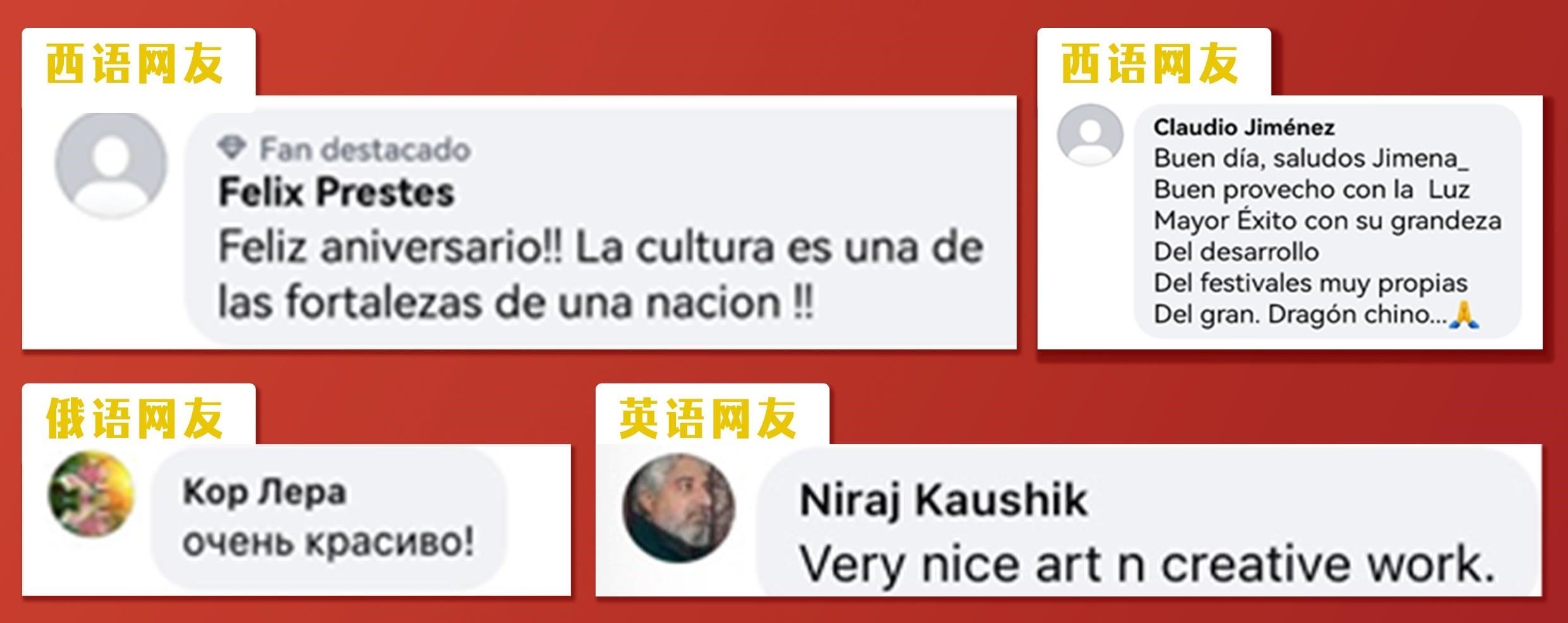 文明魅力無國界,中國文化受海外網友追捧。《彩云追月》《小雅·鹿鳴》《蒲公英的天空》等節(jié)目讓海外受眾領略了元宵晚會蘊含的文化底蘊。眾多海外網友紛紛留言表達了對中華文化和中國節(jié)日的喜愛。西語網友Claudio Jiménez留言:“中國擁有這么多自己的節(jié)日,好棒”。西語網友Felix Prestes說:“文化是一個國家的基石,祝你們節(jié)日快樂!”英語網友Niraj Kaushik和Cham Gurung評論說:“很美且很有創(chuàng)意的作品”“節(jié)目令人印象深刻,我很喜歡”。