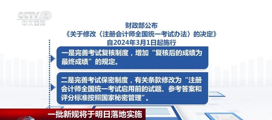財(cái)政部公布《關(guān)于修改〈注冊會計(jì)師全國統(tǒng)一考試辦法〉的決定》,自2024年3月1日起施行?!稕Q定》共修改2條。一是完善考試復(fù)核制度,增加“復(fù)核后的成績?yōu)樽罱K成績”的規(guī)定。二是完善考試保密制度,有關(guān)條款修改為“注冊會計(jì)師全國統(tǒng)一考試啟用前的試題、參考答案和評分標(biāo)準(zhǔn)按照國家秘密管理”。