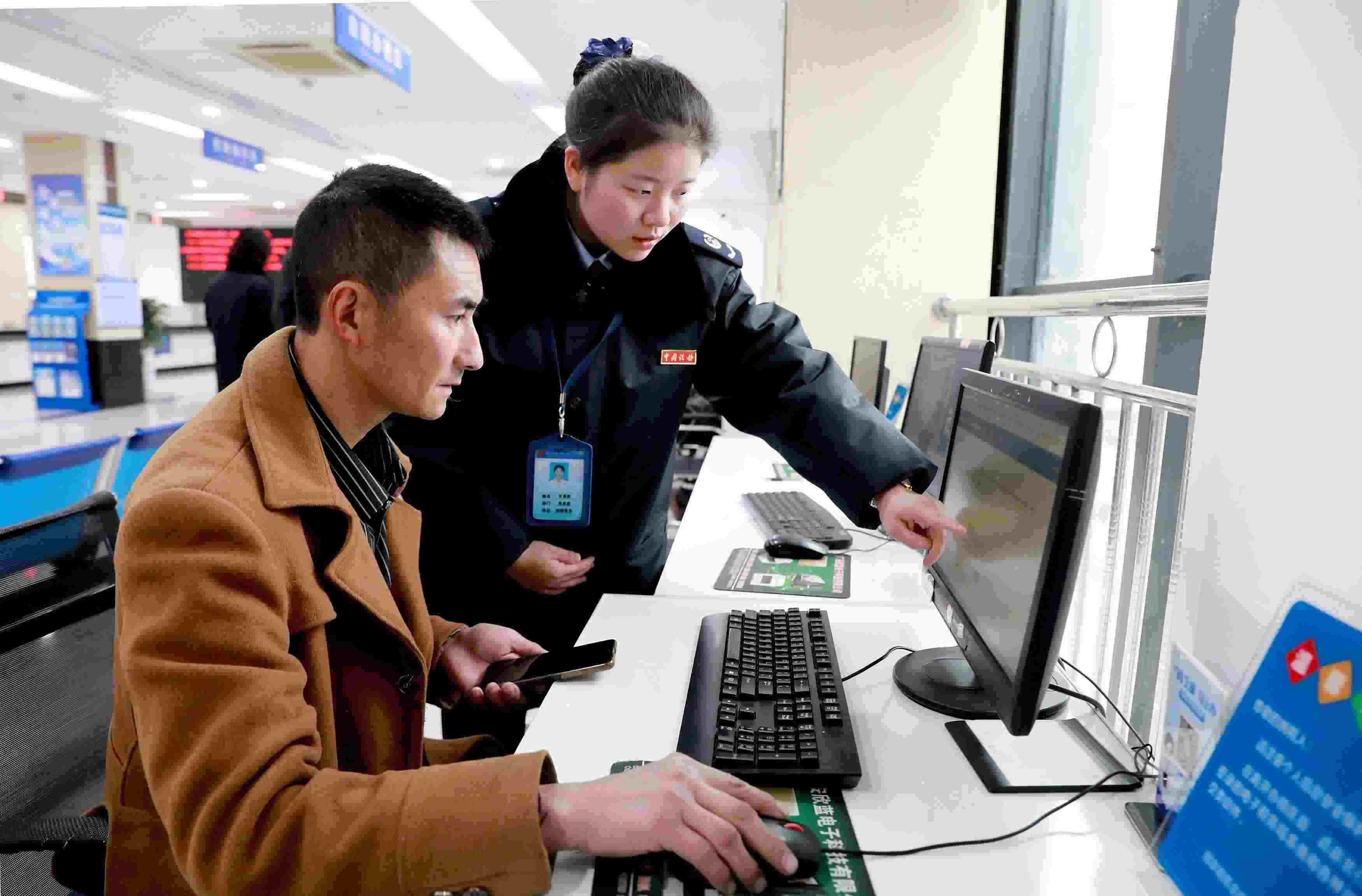 △ 2023年12月12日,四川省華鎣市政務服務大廳,稅務局流動崗位工作人員向群眾介紹網(wǎng)上自助辦理稅務事項。