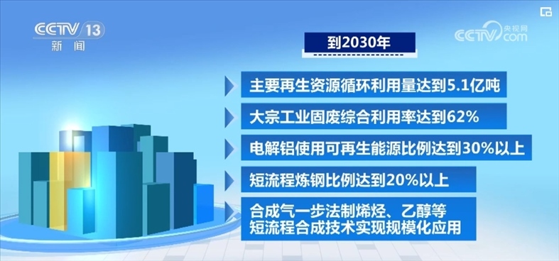 《指導(dǎo)意見》提出,到2030年,主要再生資源循環(huán)利用量達(dá)到5.1億噸,大宗工業(yè)固廢綜合利用率達(dá)到62%,電解鋁使用可再生能源比例達(dá)到30%以上,短流程煉鋼比例達(dá)到20%以上,合成氣一步法制烯烴、乙醇等短流程合成技術(shù)實(shí)現(xiàn)規(guī)模化應(yīng)用。