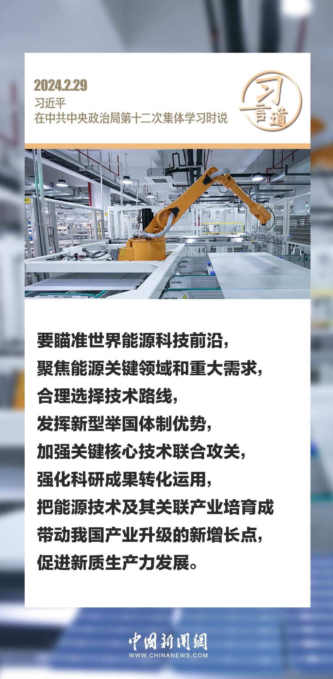 中共中央政治局2月29日下午就新能源技術(shù)與我國(guó)的能源安全進(jìn)行第十二次集體學(xué)習(xí)。中共中央總書(shū)記習(xí)近平在主持學(xué)習(xí)時(shí)強(qiáng)調(diào)——