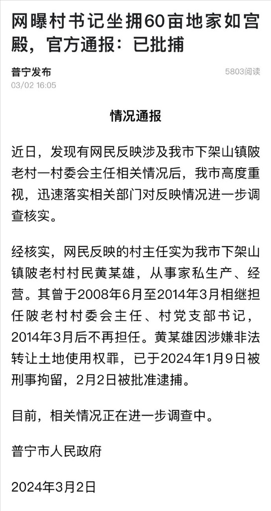 ·廣東普寧通報村支書坐擁60畝地:黃某雄因涉嫌非法轉(zhuǎn)讓土地使用權(quán)罪已被批準逮捕。