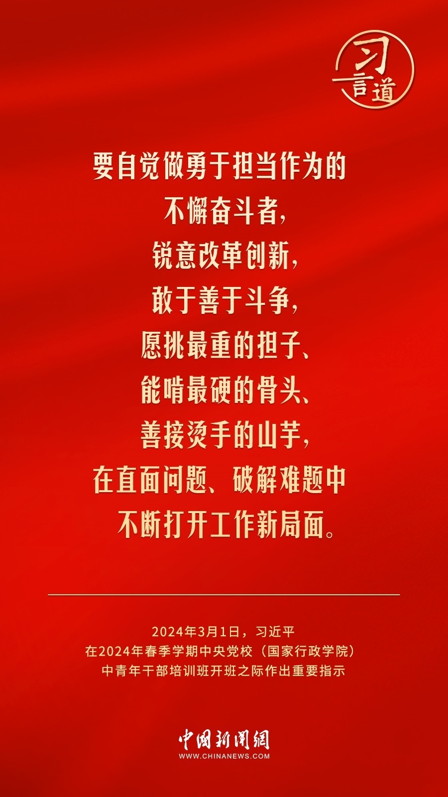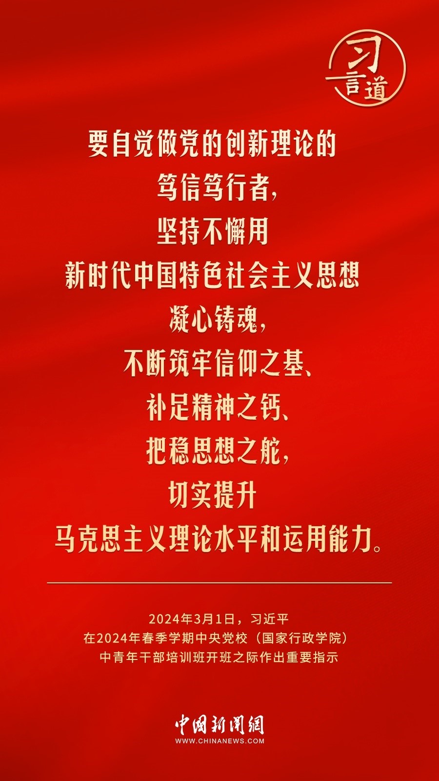 2024年春季學期中央黨校(國家行政學院)中青年干部培訓班3月1日上午在中央黨校開班。中共中央總書記、國家主席、中央軍委主席習近平作出重要指示,他強調——