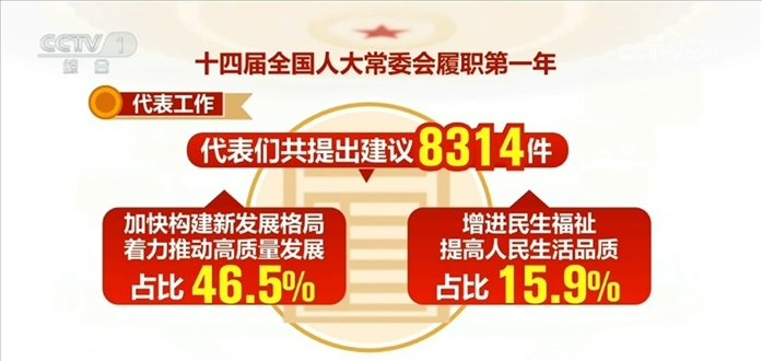 代表工作方面:十四屆全國人大一次會議期間,代表們共提出建議8314件,目前已經(jīng)全部辦理完畢并答復代表。其中,涉及加快構(gòu)建新發(fā)展格局、著力推動高質(zhì)量發(fā)展的占比46.5%,涉及增進民生福祉、提高人民生活品質(zhì)的占比15.9%。