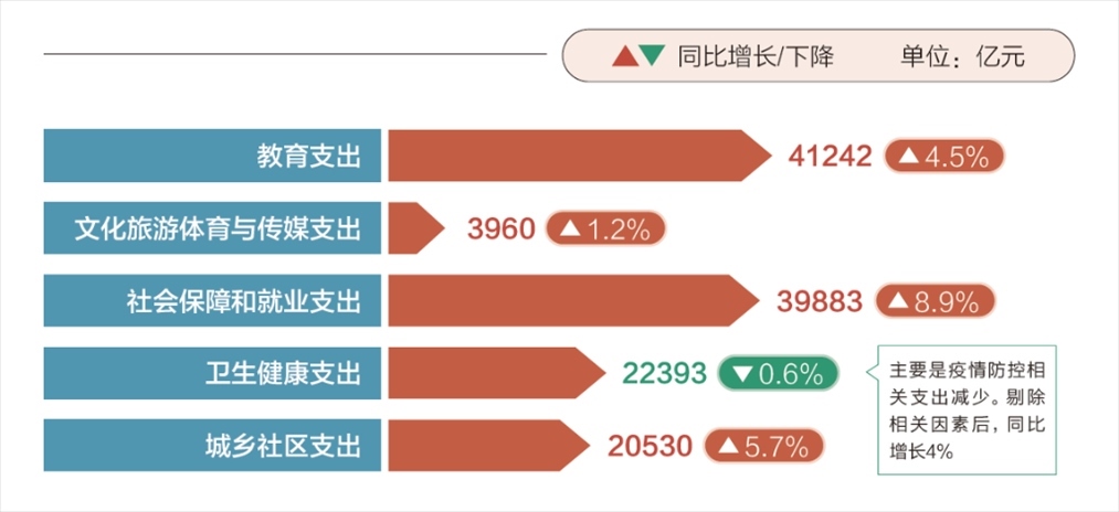 2023年,盡管財政收支壓力很大,但民生投入力度不減。超過27萬億元全國一般公共預算支出中,教育、社會保障和就業(yè)支出都在4萬億元上下,衛(wèi)生健康、城鄉(xiāng)社區(qū)支出都超過了2萬億元。