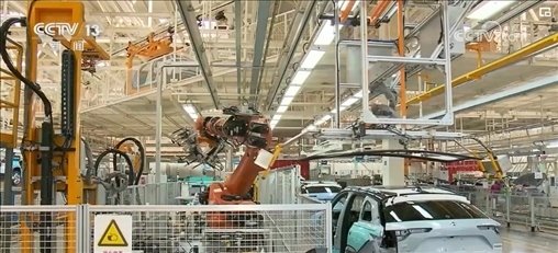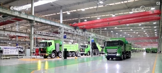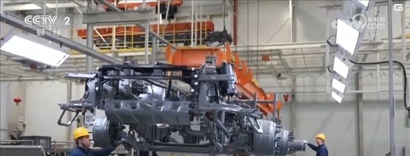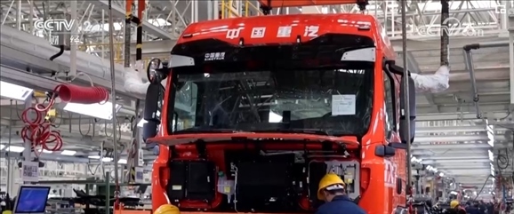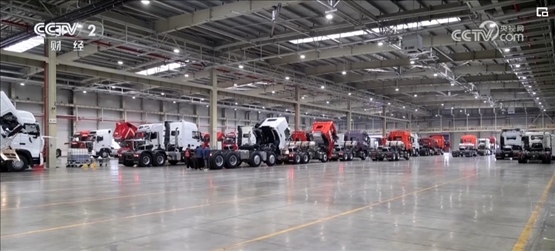 在山東濟南一家重卡生產(chǎn)企業(yè)的總裝車間里,貨運機器人將重卡的車架依次傳送到各工作站,工人熟練地將發(fā)動機、散熱器、輪胎等零件加裝到車架上。工作人員介紹,一輛重卡從接到訂單開始排產(chǎn)到交付客戶僅需五六天。