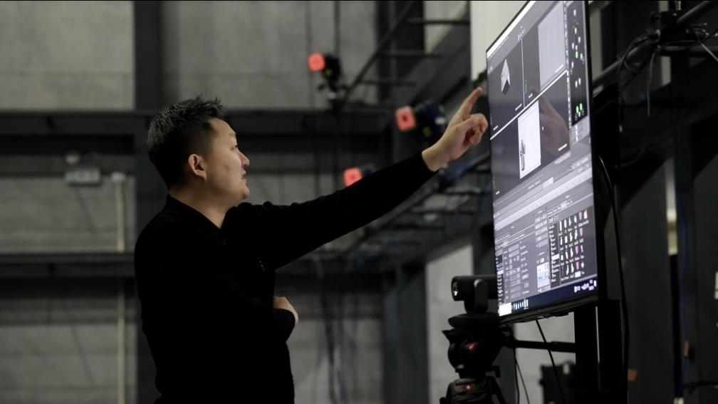 “這是動作數(shù)字孿生,利用光學(xué)動捕技術(shù),棚內(nèi)多個專業(yè)攝像頭捕捉演員身上的特定標(biāo)記,以毫秒級的速率計算出角色的運動軌跡,然后將數(shù)據(jù)傳送到電腦上,實現(xiàn)虛擬人物的動作?!眹覄勇@公共技術(shù)服務(wù)平臺動捕棚的技術(shù)顧問崔盛輯向記者介紹道。