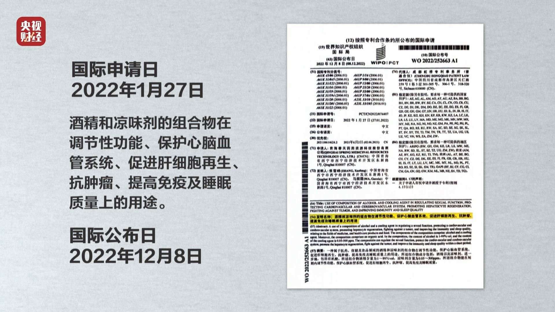 聽花酒業(yè)發(fā)展有限責(zé)任公司大區(qū)經(jīng)理:我們現(xiàn)在是在專利申請(qǐng)公布階段,這個(gè)國際知識(shí)產(chǎn)權(quán)組織在什么情況下才能把你這個(gè)申請(qǐng)公布呢,它已經(jīng)經(jīng)過試驗(yàn),證實(shí)這些數(shù)據(jù)是有效、真實(shí)的,就會(huì)把這個(gè)專利公布出來,因?yàn)槁牷ň频慕】祪r(jià)值是最值錢的。