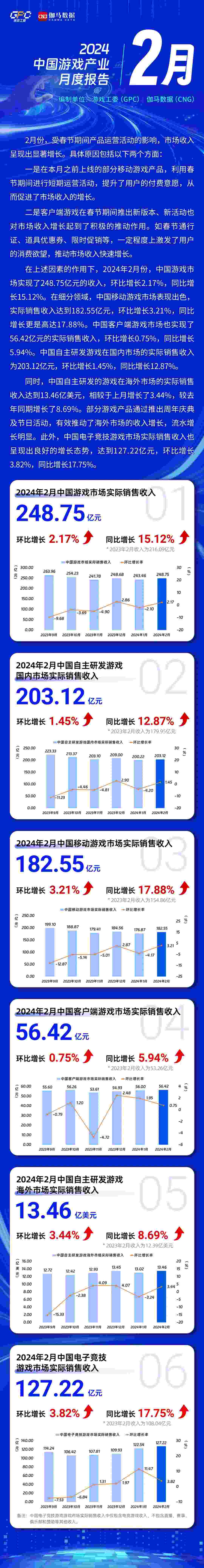 央視網(wǎng)消息:3月20日,據(jù)中國音數(shù)協(xié)游戲工委官微消息,2024年2月中國游戲產(chǎn)業(yè)月度報(bào)告發(fā)布。報(bào)告顯示,2024年2月份,中國游戲市場實(shí)現(xiàn)了248.75億元的收入,環(huán)比增長2.17%,同比增長15.12%。在細(xì)分領(lǐng)域,中國移動游戲市場表現(xiàn)出色,實(shí)際銷售收入達(dá)到182.55億元,環(huán)比增長3.21%,同比增長更是高達(dá)17.88%。中國客戶端游戲市場也實(shí)現(xiàn)了56.42億元的實(shí)際銷售收入,環(huán)比增長0.75%,同比增長5.94%。中國自主研發(fā)游戲在國內(nèi)市場的實(shí)際銷售收入為203.12億元,環(huán)比增長1.45%,同比增長12.87%。