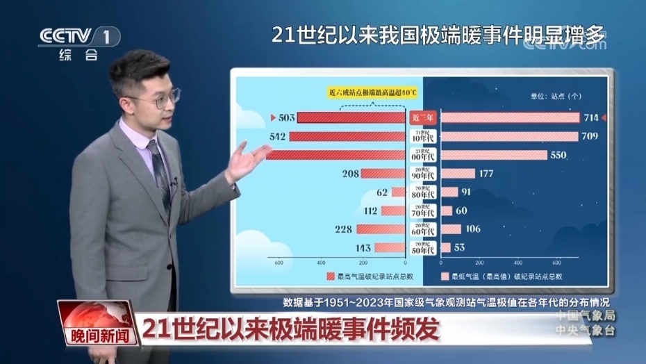 氣象分析師 胡嘯:我們統(tǒng)計(jì)了上世紀(jì)50年代以來(lái)氣溫創(chuàng)紀(jì)錄的站點(diǎn),從白天的國(guó)家級(jí)氣象站創(chuàng)紀(jì)錄站點(diǎn)來(lái)看,有百分之七十都出現(xiàn)在21世紀(jì),近三年數(shù)量達(dá)到了503個(gè),在這其中有六成站點(diǎn)的極端最高氣溫都突破了40℃。不僅白天的氣溫高,夜間的氣溫也很高,大致有百分之八十的站點(diǎn)都出現(xiàn)在21世紀(jì)。近三年是達(dá)到了714個(gè),這要比以往任何十年的累加都要多。