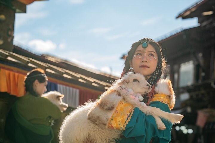 游人在獨(dú)克宗古城里抱著小羊拍照留念(2023年3月8日攝)。