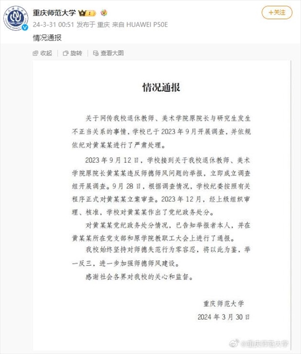 ·重慶師大通報“美院原院長與學(xué)生有不正當關(guān)系”:黨紀政務(wù)處分。