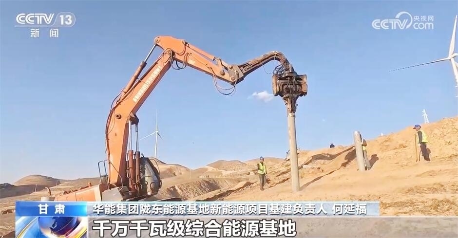 在我國首個千萬千瓦級多能互補(bǔ)綜合能源基地——華能隴東能源基地,施工現(xiàn)場一片繁忙景象。目前,基地已建成投產(chǎn)100萬千瓦容量,在建500萬千瓦容量。