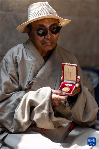 白瑪老人展示自己的全國(guó)勞動(dòng)模范獎(jiǎng)?wù)拢?月27日攝)。新華社記者 姜帆 攝