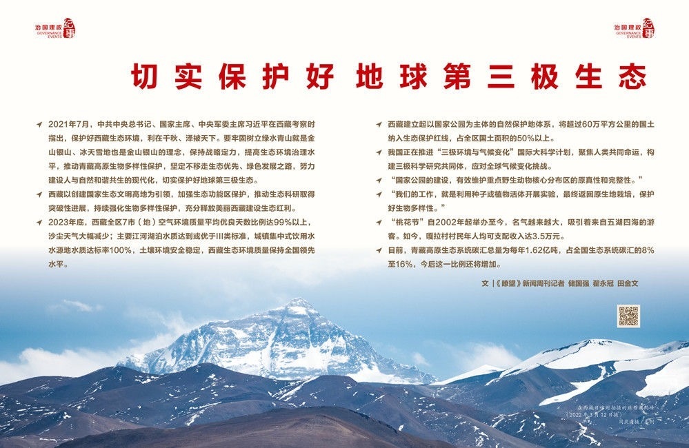 ◇2021年7月,中共中央總書記、國家主席、中央軍委主席習近平在西藏考察時指出,保護好西藏生態(tài)環(huán)境,利在千秋、澤被天下。要牢固樹立綠水青山就是金山銀山、冰天雪地也是金山銀山的理念,保持戰(zhàn)略定力,提高生態(tài)環(huán)境治理水平,推動青藏高原生物多樣性保護,堅定不移走生態(tài)優(yōu)先、綠色發(fā)展之路,努力建設(shè)人與自然和諧共生的現(xiàn)代化,切實保護好地球第三極生態(tài)。