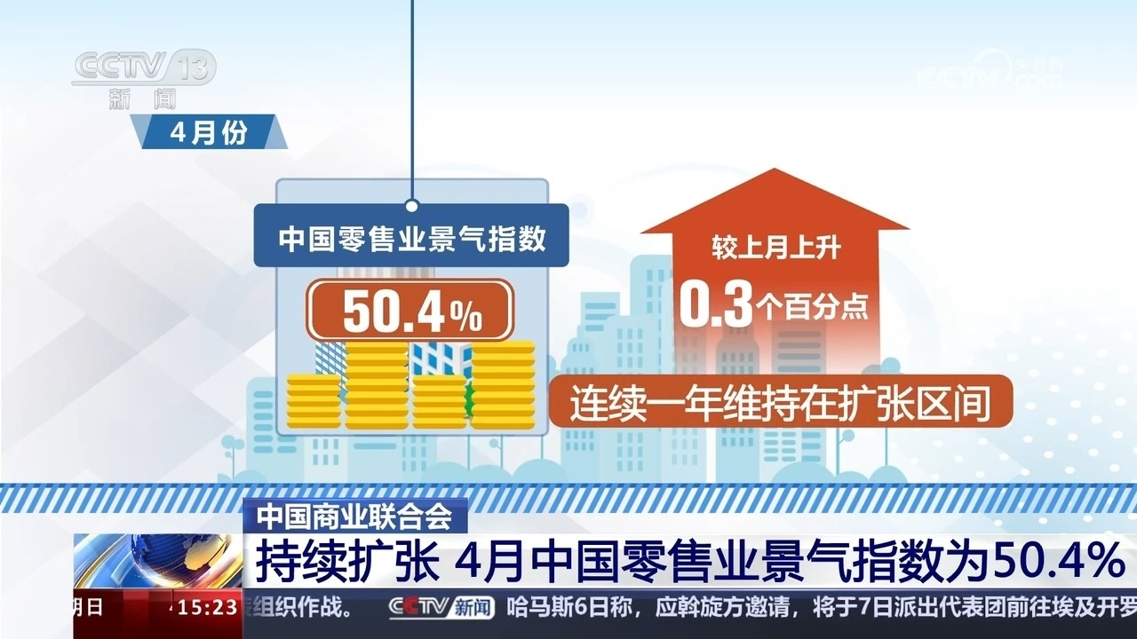 央視網(wǎng)消息:中國(guó)商業(yè)聯(lián)合會(huì)最新發(fā)布的中國(guó)零售業(yè)景氣指數(shù)顯示,4月份,中國(guó)零售業(yè)景氣指數(shù)為50.4%,連續(xù)一年維持在擴(kuò)張區(qū)間。全國(guó)商品經(jīng)營(yíng)類企業(yè)對(duì)4月份盈利增長(zhǎng)恢復(fù)的預(yù)期開(kāi)始好轉(zhuǎn)。