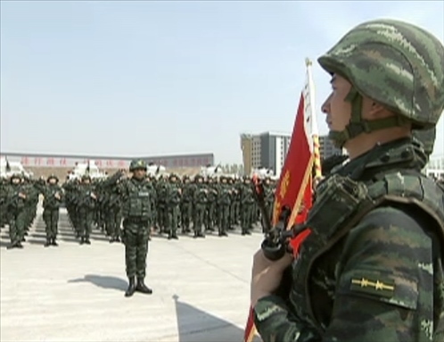 △2014年4月9日,“獵鷹突擊隊(duì)”授旗儀式上,全體隊(duì)員向隊(duì)旗行舉手禮并莊嚴(yán)宣誓。