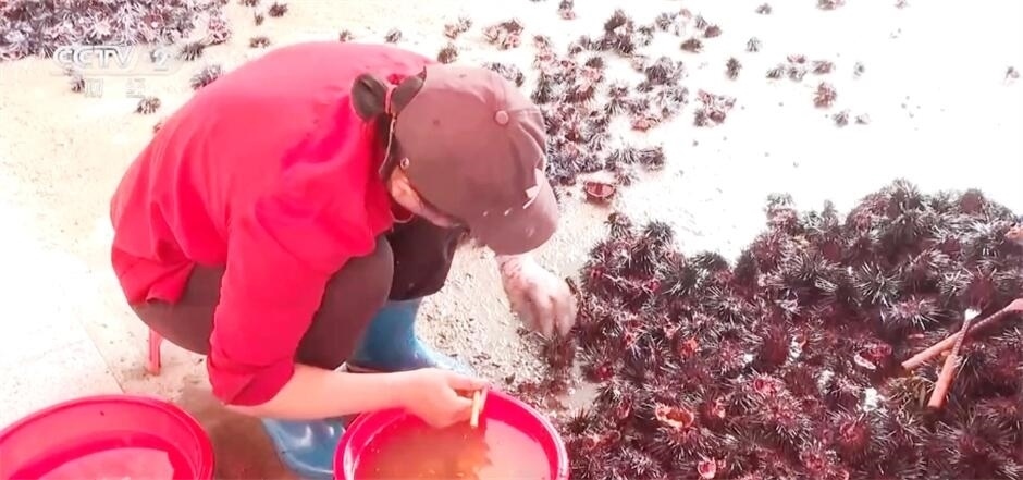 在海膽加工廠里,工人們熟練地撬開海膽殼,挖出海膽肉,用鑷子將雜質去除,再用清水清洗干凈,一份色澤金黃、品質新鮮的海膽肉就呈現(xiàn)在眼前了。