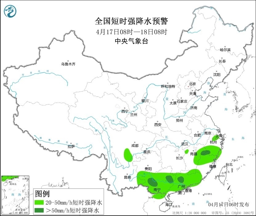 預(yù)計4月17日08時至18日08時,江西東北部、浙江南部、福建北部、廣西東部和西南部、廣東中東部和西北部等地的部分地區(qū)將有8-10級雷暴大風(fēng)或冰雹天氣,局地風(fēng)力可達(dá)11級以上;江西中北部和南部、浙江、福建、四川南部、貴州西南部、云南東南部、廣西、廣東等地的部分地區(qū)將有短時強降水天氣,最大小時雨量30-60毫米,局地可達(dá)70毫米以上。