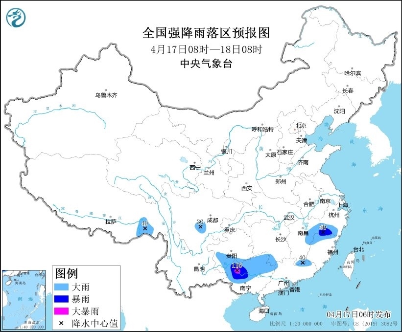 預(yù)計,4月17日08時至18日08時,江西中北部、浙江南部、福建西北部、四川盆地西南部、貴州東南部、廣西中北部、廣東北部等地部分地區(qū)有大到暴雨,其中,廣西西部等地局地有大暴雨(100~110毫米)。上述部分地區(qū)伴有短時強降水(最大小時降雨量30~60毫米,局地可超過70毫米),局地有雷暴大風(fēng)等強對流天氣。
