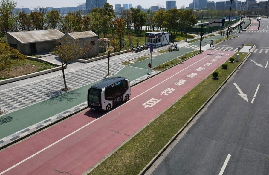 在中國(上海)自由貿(mào)易試驗(yàn)區(qū)臨港新片區(qū),一輛無人駕駛汽車行駛在自動駕駛測試專用路上(無人機(jī)照片,2024年4月9日攝)。