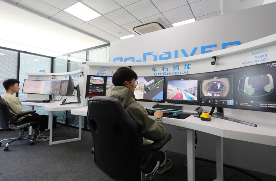 在位于中國(上海)自由貿(mào)易試驗(yàn)區(qū)臨港新片區(qū)的一家智能駕駛企業(yè),工作人員通過無人駕駛汽車遠(yuǎn)程監(jiān)管平臺的實(shí)時畫面,結(jié)合電子地圖對在自動駕駛測試專用路上行駛的車輛進(jìn)行監(jiān)管(2024年4月9日攝)。