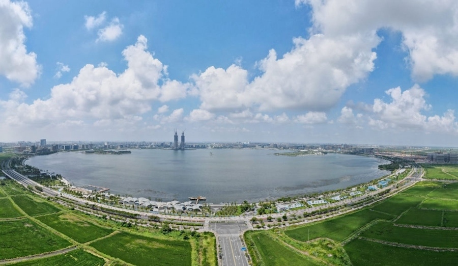 這是中國(上海)自由貿(mào)易試驗(yàn)區(qū)臨港新片區(qū)滴水湖(無人機(jī)全景照片,2023年9月6日攝)。