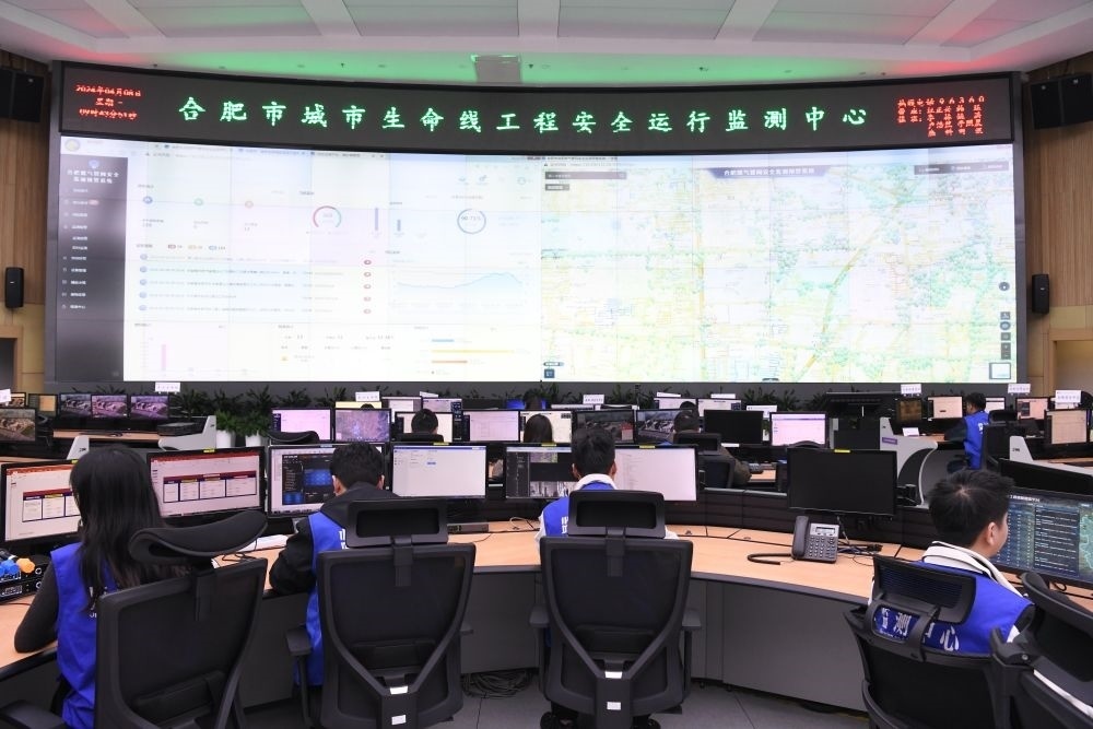 技術(shù)人員在位于清華大學(xué)合肥公共安全研究院的合肥市城市生命線工程安全運(yùn)行監(jiān)測中心值守(2024年4月8日攝)。合肥市2015年啟動(dòng)城市生命線安全工程建設(shè),逐步構(gòu)建燃?xì)狻蛄?、供水、排水、熱力、綜合管廊、消防、水環(huán)境八大領(lǐng)域立體化監(jiān)測網(wǎng),探索出一條以場景應(yīng)用為依托、以智慧防控為導(dǎo)向、以創(chuàng)新驅(qū)動(dòng)為內(nèi)核、以市場運(yùn)作為抓手的城市安全發(fā)展新模式。