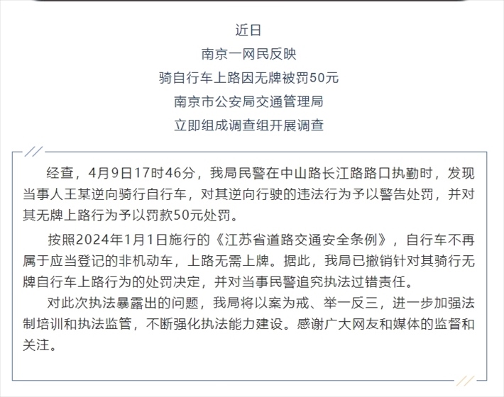 ·南京交警回應(yīng)市民騎自行車無(wú)牌被罰50元:撤銷處罰,追究民警責(zé)任。