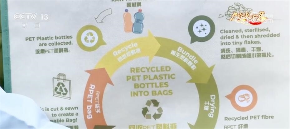 記者發(fā)現(xiàn)了一種用PET塑料瓶為原料制成的環(huán)保購(gòu)物袋。PET簡(jiǎn)稱聚酯,是一種常見的塑料材料,企業(yè)將這類塑料瓶回收后,經(jīng)過處理變成細(xì)小的瓶片,再經(jīng)融化和擠壓后變成纖維、織成布,最后就得到了一個(gè)可以循環(huán)使用的購(gòu)物袋。