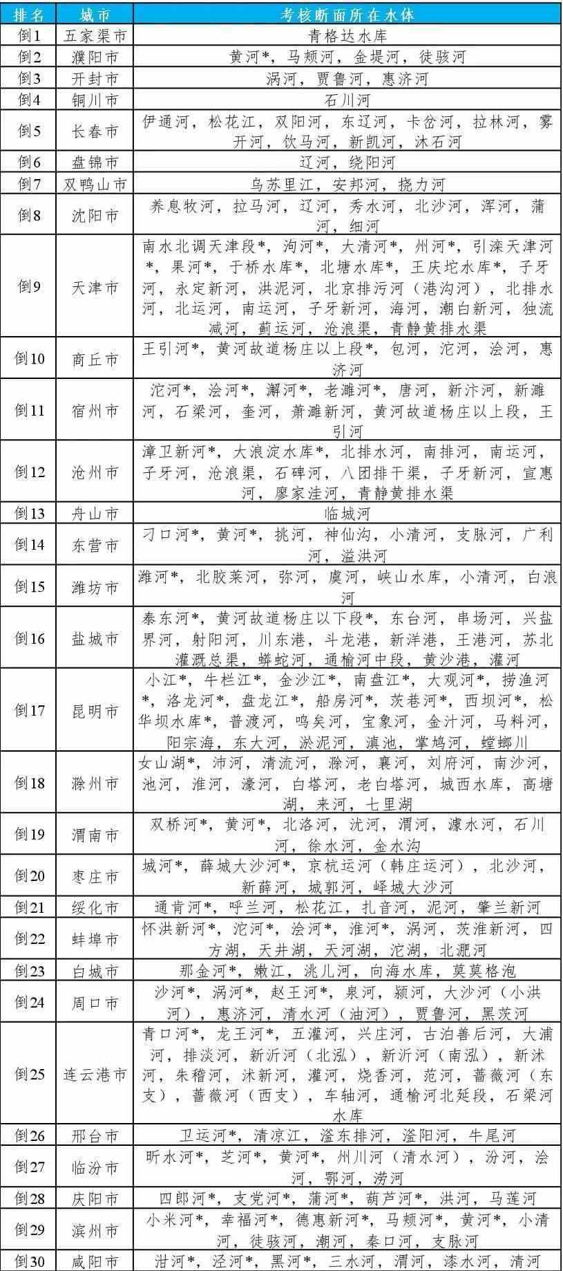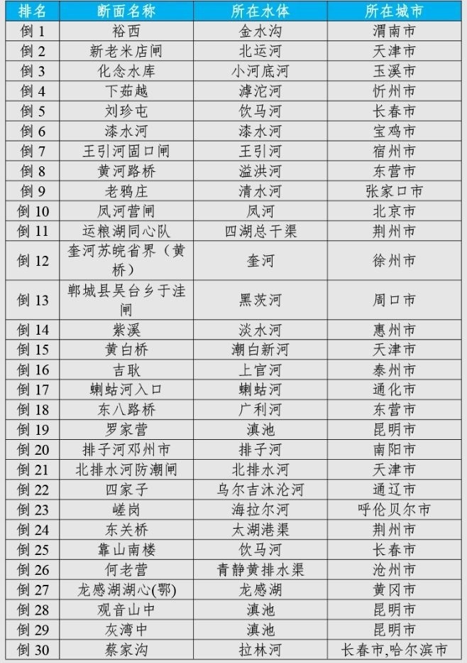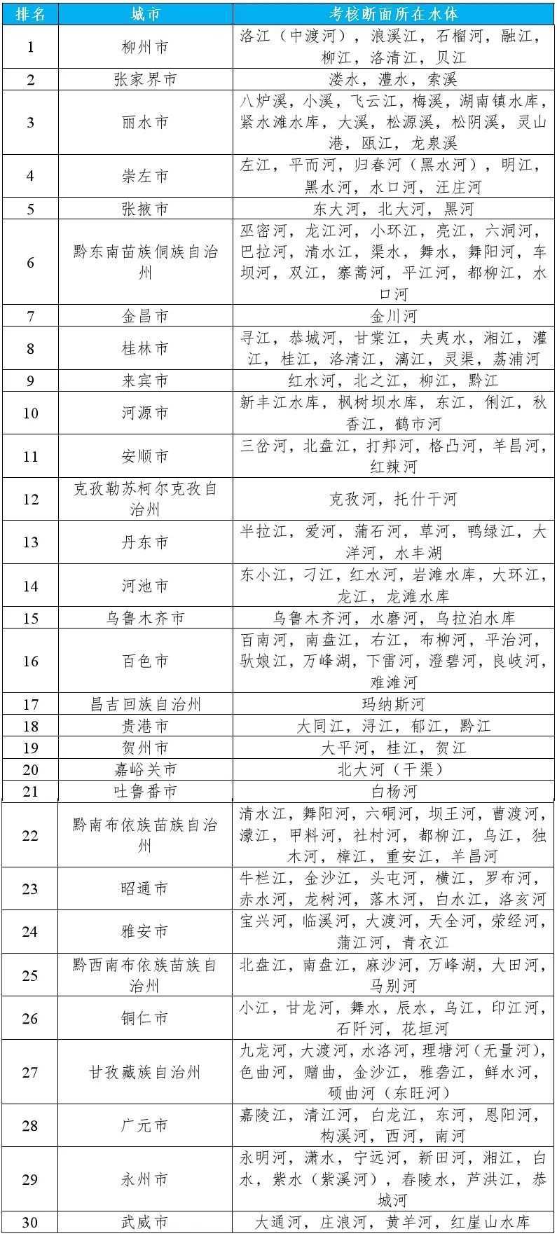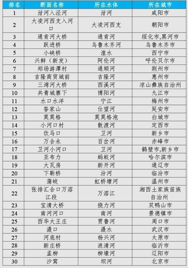 咸陽市泔河入涇河、朝陽市大凌河西支入河口和綏化市/黑河市通肯河大橋等30個(gè)國家地表水考核斷面水環(huán)境質(zhì)量變化情況相對(duì)較好(從第1名至第30名),渭南市裕西、天津市新老米店閘和玉溪市化念水庫等30個(gè)國家地表水考核斷面水環(huán)境質(zhì)量變化情況相對(duì)較差(從倒數(shù)第1名至倒數(shù)第30名)。