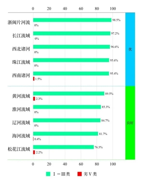 1—3月,長江、黃河、珠江、松花江、淮河、海河、遼河等七大流域及西北諸河、西南諸河和浙閩片河流水質(zhì)優(yōu)良(Ⅰ—Ⅲ類)斷面比例為91.5%,同比上升1.2個(gè)百分點(diǎn);劣Ⅴ類斷面比例為0.5%,同比上升0.1個(gè)百分點(diǎn)。主要污染指標(biāo)為化學(xué)需氧量、高錳酸鹽指數(shù)和氨氮。其中,長江流域、珠江流域、浙閩片河流、西北諸河和西南諸河水質(zhì)為優(yōu);黃河流域、松花江流域、淮河流域、海河流域和遼河流域水質(zhì)良好。