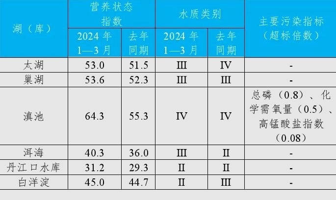 1—3月,監(jiān)測(cè)的201個(gè)重點(diǎn)湖(庫)中,水質(zhì)優(yōu)良(Ⅰ—Ⅲ類)湖庫個(gè)數(shù)占比82.1%,同比上升1.1個(gè)百分點(diǎn);劣Ⅴ類水質(zhì)湖庫個(gè)數(shù)占比4.5%,同比下降0.1個(gè)百分點(diǎn)。主要污染指標(biāo)為總磷、化學(xué)需氧量和高錳酸鹽指數(shù)。181個(gè)監(jiān)測(cè)營養(yǎng)狀態(tài)的湖(庫)中,中度富營養(yǎng)的9個(gè),占5.0%;輕度富營養(yǎng)的31個(gè),占17.1%;其余湖(庫)為中營養(yǎng)或貧營養(yǎng)狀態(tài)。其中,太湖和巢湖水質(zhì)均為良好、輕度富營養(yǎng);滇池為輕度污染、中度富營養(yǎng),主要污染指標(biāo)為總磷、化學(xué)需氧量和高錳酸鹽指數(shù);洱海水質(zhì)良好、中營養(yǎng);丹江口水庫和白洋淀水質(zhì)均為優(yōu)、中營養(yǎng)。