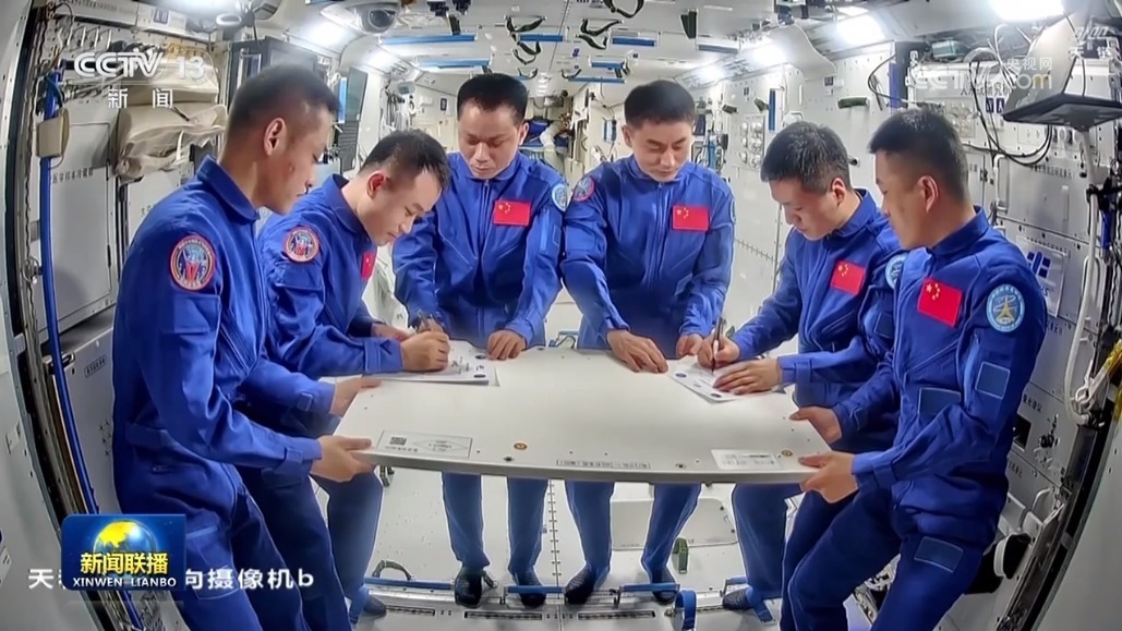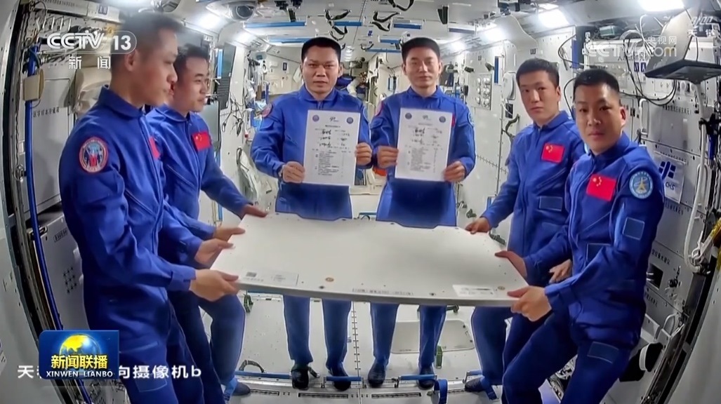下午三時(shí)許,神舟十七號(hào)航天員湯洪波、唐勝杰、江新林和神舟十八號(hào)航天員葉光富、李聰、李廣蘇在空間站天和核心艙在軌舉行交接儀式,6名航天員分別在確認(rèn)書(shū)上簽字。