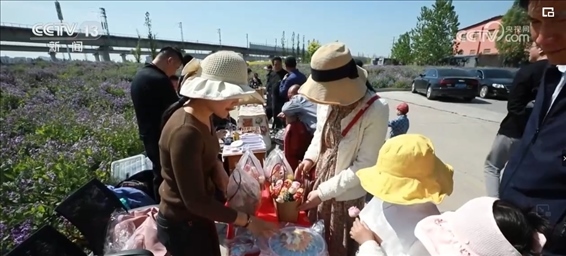 一年前,這里還是一片工地遺留的建筑渣土。當?shù)嘏c科研團隊合作,引進營養(yǎng)土技術(shù),一年內(nèi)就將撂荒地變成了“桃花源”?;ê_呥€擺起了創(chuàng)意市集,結(jié)合“花”元素的花餑餑、非遺農(nóng)民畫和黑陶工藝品,吸引了不少游客消費。
