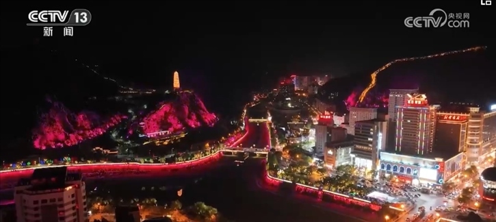 隨著夜幕降臨,寶塔山化身為一幅巨大的畫布,上演著音樂燈光秀。聲光合一、三山聯(lián)動,360度環(huán)繞演繹,生動展現(xiàn)了延安的紅色故事和文化特色。
