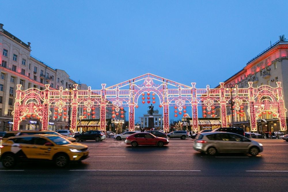 2024年2月9日,在俄羅斯首都莫斯科,車輛在中國(guó)新年主題裝飾前駛過(guò)。當(dāng)日,“莫斯科的中國(guó)新年”文化活動(dòng)在俄羅斯首都莫斯科市中心啟動(dòng)。新華社記者 白雪騏 攝
