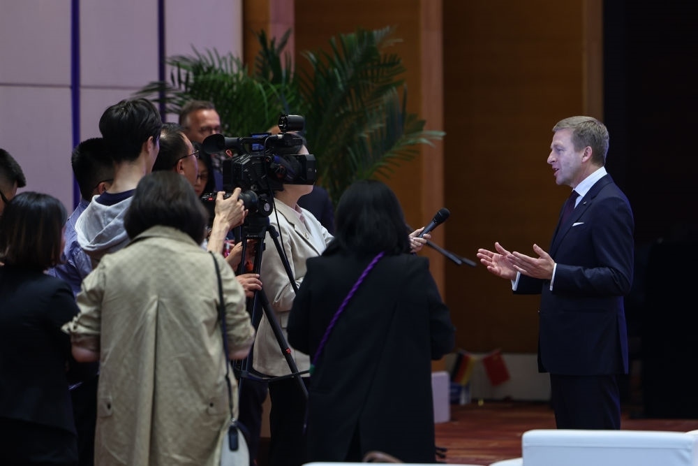 2024年4月26日,遼寧省沈陽(yáng)市與寶馬集團(tuán)深化戰(zhàn)略合作簽約儀式在沈陽(yáng)舉行,這是寶馬集團(tuán)董事長(zhǎng)齊普策接受采訪。新華社記者 潘昱龍 攝
